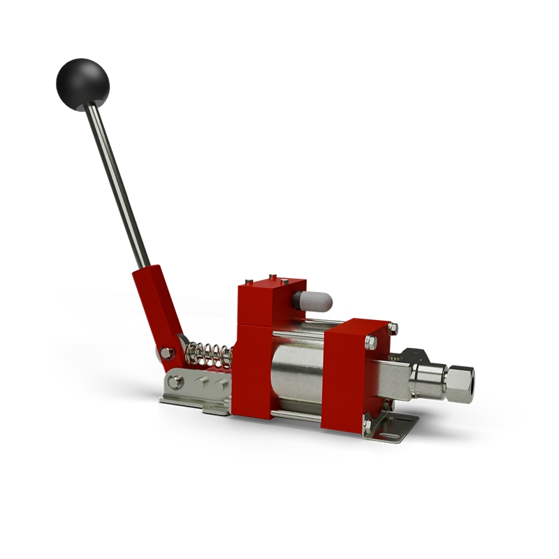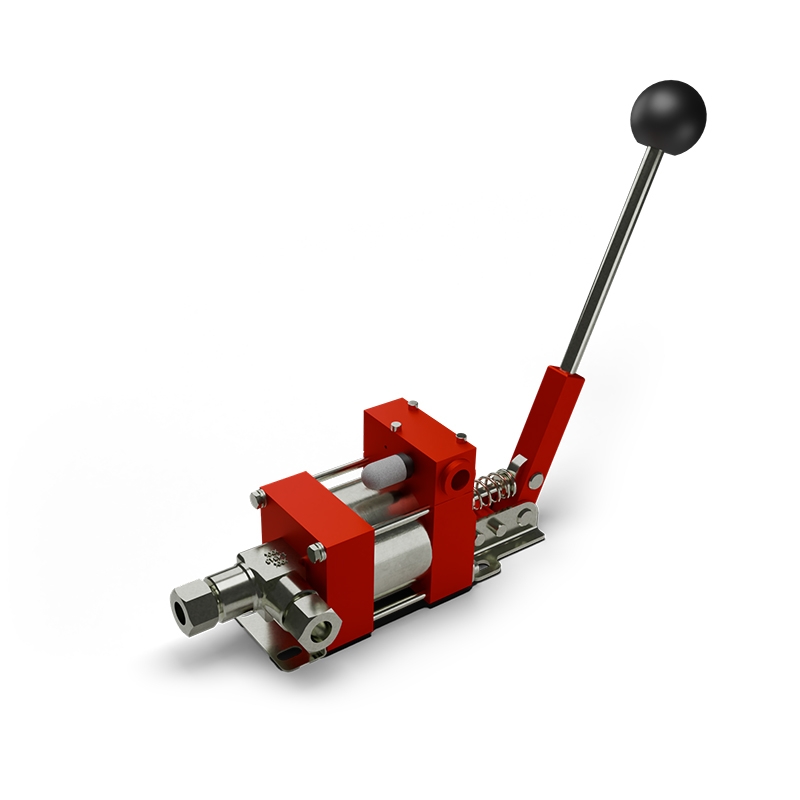 Пневматический поршневой насос Maximator M 37-HL, оснащенный ручным дублером для нагнетания давления.