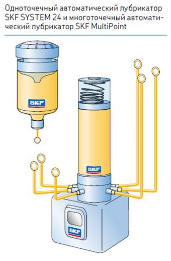 Автоматические лубрикаторы и ручной инструмент SKF просты в использовании и обеспечивают регулярную и контролируемую подачу пластичной смазки в подшипниковые узлы. Кроме того, автоматическое повторное смазывание позволяет избежать загрязнения подшипника. SKF предлагает автоматические лубрикаторы SKF SYSTEM 24 и SKF MultiPoint, которые обеспечивают надёжную и дозированную подачу пластичной смазки в подшипниковые узлы 24 часа в день, 7 дней в неделю, 52 недели в году, если потребуется. Всё, что Вам нужно будет сделать, это установить нужный интервал.