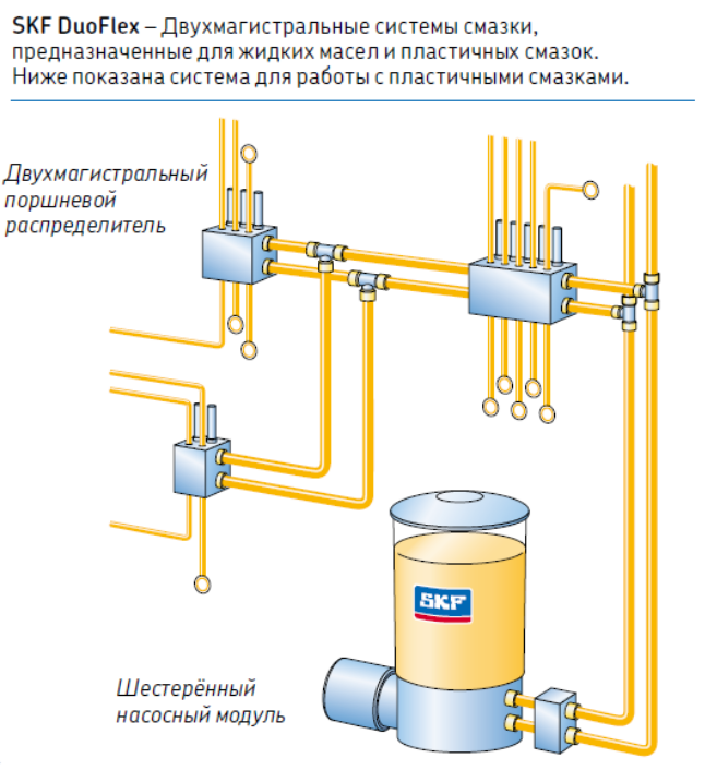 Для системы нужны две главные магистрали, в которые последовательно поступает смазка. Системы SKF DuoFlex очень надёжны в работе с пластичными смазками при большом расстоянии от насосного модуля (100 метров и более). Системы смазки SKF DuoFlex характеризуются высокой гибкостью в регулировке расхода смазки в соответствии с требованиями отдельной точки смазки. Кроме того, параллельная установка двухмагистральных дозирующих клапанов обеспечивает простоту конструкции и её использования. Двухмагистральные системы смазки SKF DuoFlex могут обеспечивать более 1 000 точек с высокой надёжностью смазывания при давлении до 400 бар от одного насосного модуля.