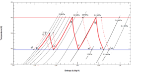 Линии на диаграмме — постоянные давлений (изобары). Точки минимумов температур a, c, e, g соответствуют температуре Т=293 К. Точки максимумов температуры b, d, f отложенные на изобарах определены аналитически и соответствуют адиабатическому процессу сжатия в соответствии с достижимым кпд согласно [3]. Верхняя граница процесса описываемого в изобретении ограничена красной чертой соответствующей температуре Т=413 К.