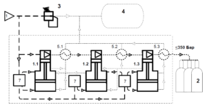Цифрами обозначены: 1 – источник давления; 1.1, 1.2, 1.3 — усилители давления; 2 –баллоны высокого давления, 4- потребитель газа низкого давления; 5.1, 5.2, 5.3 – рекуперативные теплообменники, 6 – утечка газа через уплотнения по штокам усилителей давлений.