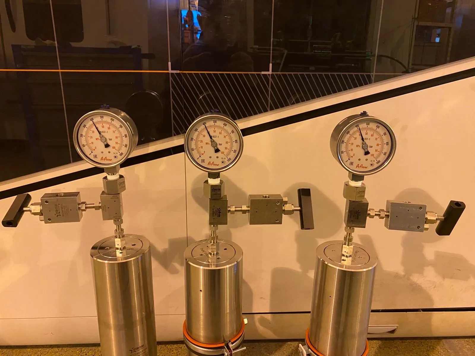 Для контроля состояния, на гидроаккумуляторы были установлены запорные клапаны и манометры из нержавеющей стали, что пресекает риски образования коррозии и повышает стойкость оборудования к агрессивным условиям окружающей среды.